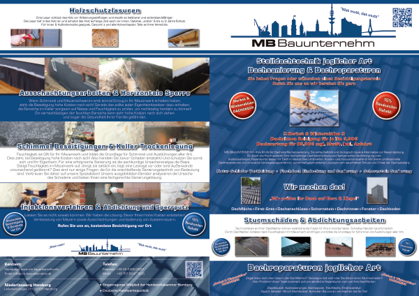 Wir bei "MB-Bauunternehm" stehen Ihnen mit umfassenden Dacharbeiten zur Seite. Von kleinen Reparaturen bis zur kompletten Dachsanierung. Ganz gleich, ob Satteldach, Flachdach oder Steildach - Wir sichern Qualität. Langlebigkeit und perfekte Ausführung. Hochwertige und fachgerechte Ausbesserungen, Reparaturen lassen Ihr Dach in neuem Glanz erstrahlen. Kosten- und ressourcensparend! Wir bieten professionelle Dachsanierung und innovative Reparaturen. Sowie maßgeschneiderte Lösungen zum dauerhaften Schutz und Erhalt der Dachsubstanz.